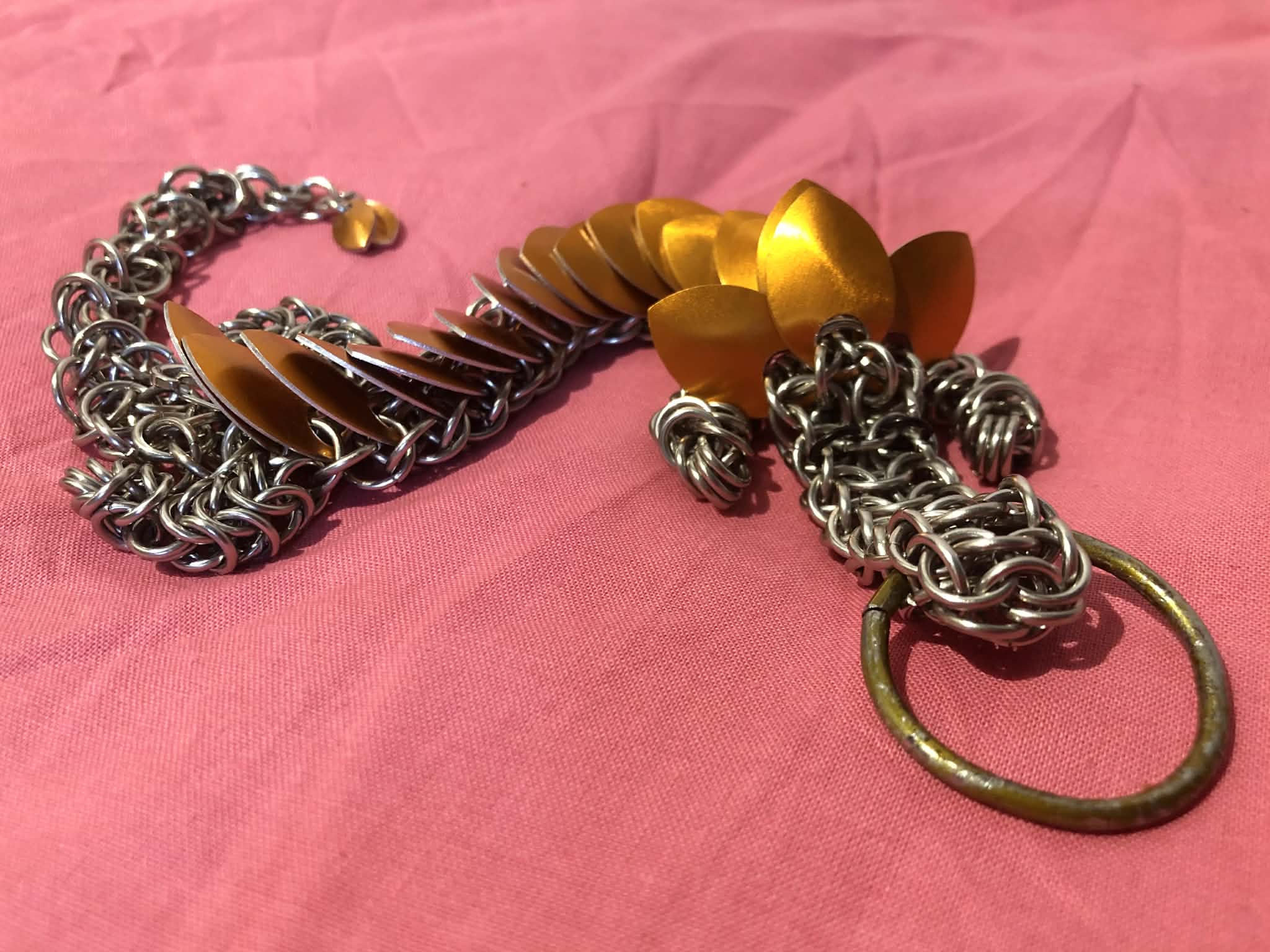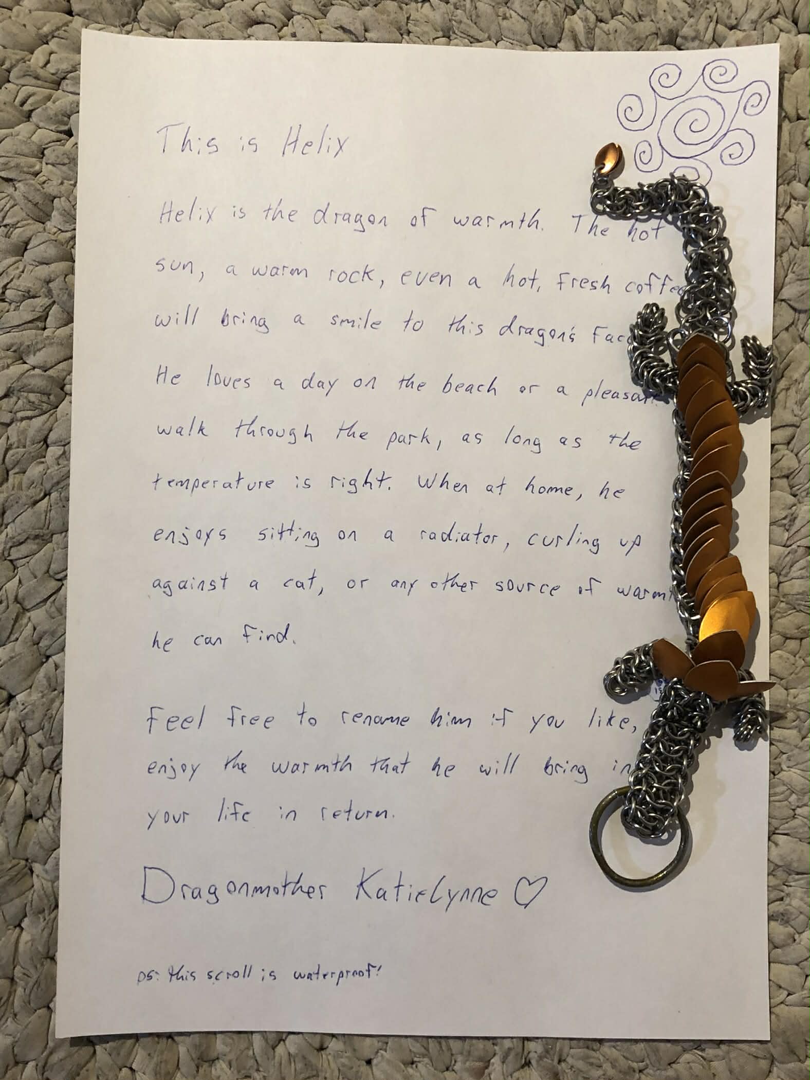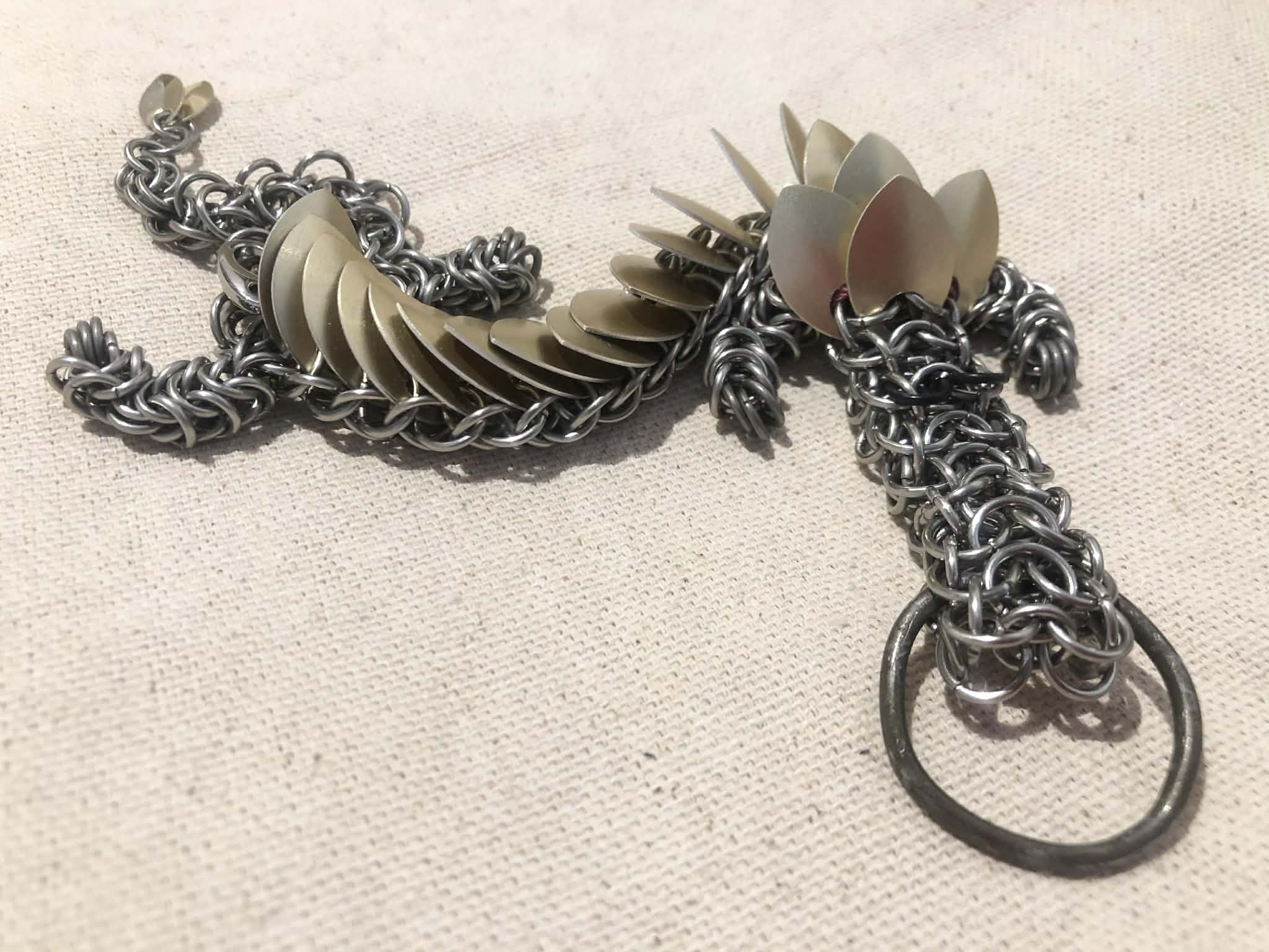 | Albert - December 20, 2018 Albert is the dragon of power. He experiences much and remembers all. The primary of my piecemeal dragons, he is used in reference when any new ones are made. His upper tail especially, the strand of Elfweave, has been used to start the tail of virtually every dragon I have made. Humble, important, and powerful, this dragon watches the birth of every new dragon to follow. He had been given a name long ago, and consisted of only the Elfweave section, an arm, and eventually a head. A second section of Elfweave and an arm were made for Jill long ago too. On one solid chainmailling afternoon though, both of the piecemeal dragons were complete, both to remain safe with me forever ❤ |