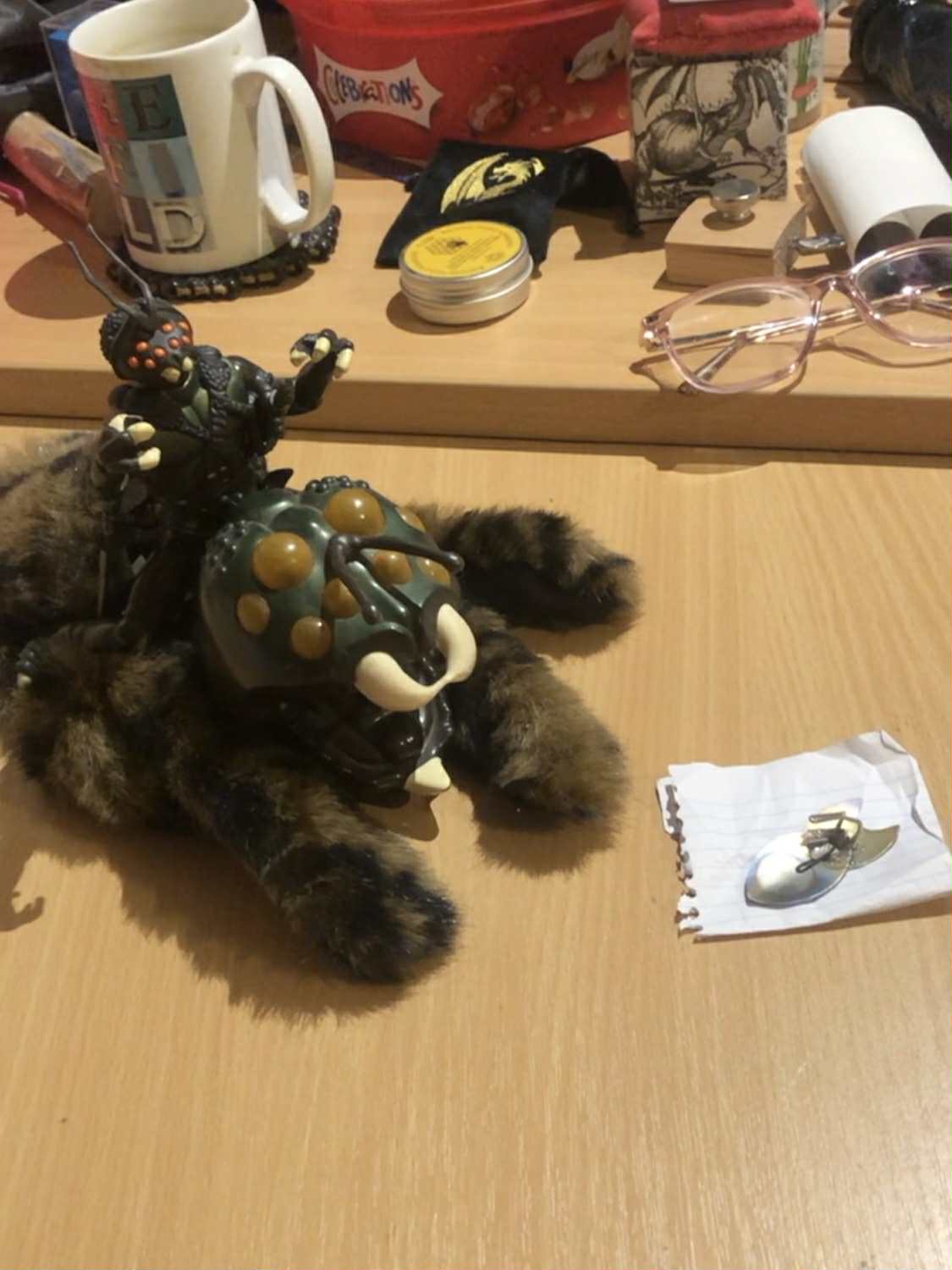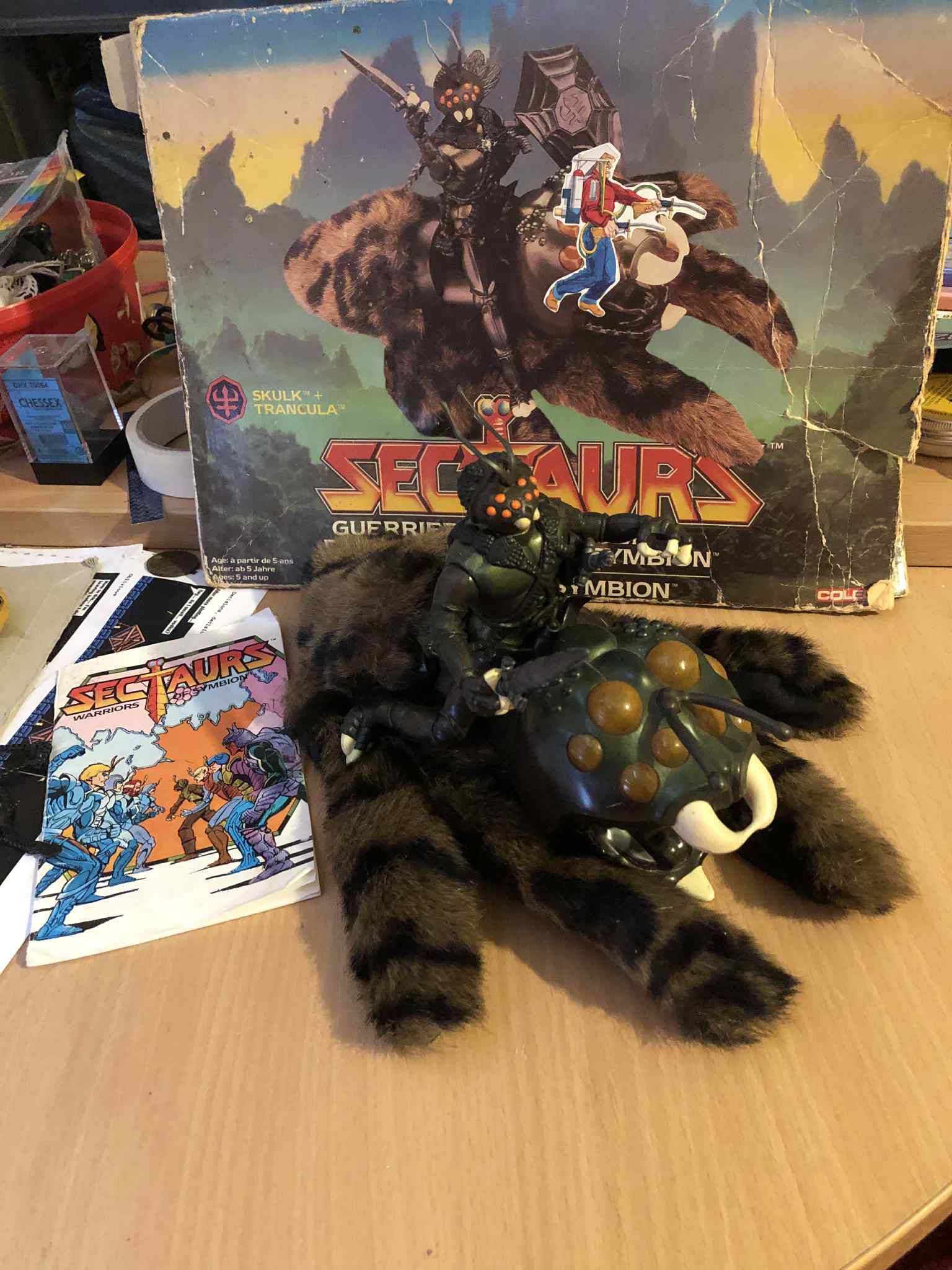 The original original one, as a basically feral child, I of course chewed apart the antennae, the rubbery white teeth, even the saddle. I loved that thing. Now at some point later on, that glove monster living with me through all of my life, I ended up finding a half-broken one at a garage sale and was able to replace the gnarled parts. Also I painted the tongue red, which I didn't end up liking, but oh well. And then that one ended up disappearing somewhere along the line, either lost in a move or whatever, and I bought another one online, with the missing Skulk figure atop (the spider-glove is named Trancula). That one ended up going missing, I think with a box that didn't make it to England. So now, I've bought a third one, third time's the charm! Now, this Skulk didn't come with all of the accessories (the last one at least had the insect wing spear thing). It actually didn't come with any accessories, I ended up doing a second ebay purchase to get two swords (strangely), a spare harness, the box (kinda cool), and more importantly (aside from the swords), the mini comic book! So those are treasured items returned to my collection (the comic you can read here [sectaurs.com]), and I was happy. Except... this can be improved. His holster is empty! Sure, he has two swords, but... but he had a... spear? I think from my research, that heart thing is supposed to be a spear, and a shield! So it started with a shield. I still had some large chainmaille scales, so I glued a few of those together, and used wire and JB-Weld (good ol' JB-Weld) to form a grip for Skulk to grab onto. But... I still had some epoxy left! Ummm, ok, ok, let's kinda halfway form the pistol shape out of that bit, why not, let's give him a ranged attack. And in the midst of that, I went back into my childhood again, a little bit. Back in the day, I used to make accessories for my toys by hammering a nail flat on the back of a table vice, vaguely sharpening it, and using whatever tape was around (usually electrical tape) to bulk up the grip. I decided to give a nod back to that, and though I didn't have any nails around, I did have coathanger wire, which is mild steel wire of about the right diameter! So in going back to my favourite "sword" that I made back then, I created a sickle shape (we had scythes all over the place growing up), but a bit longer to turn it into a sickle-spear! Yah, that sounds like something young me would have come up with lol. So we hammered the sickle end and spear end flat (except here just on an old rusty plate of steel on the grass), but this time, also to better bulk out the back of the shield and laser pistol (all cartoons had laser pistols lol), I used that JB-Weld again. We made all the grips the right size, and then carved some decorative linework into all of the things, and... WOOH, we have accessories! Am I gonna paint it, nah. The original accessories were all a single colour, paint would just rub off, and this actually matches pretty good anyway! And it's simple, rough, pretty much like I would have done when I was 10. Added bonus tho, I did balance the sickle-spear around the main shaft, so that it would (in theory) throw straight! And they came out awesome, and it looks cool clipped to the back of Skulk's harness, and the holster is full when he puts his sword away, and I am happy, WOOH! A quick several day build reliving my childhood a little bit. Also as an addendum to the story, in the first pic, we have the ORIGINAL original Battle Beetle toy with Pinsor riding him, that somehow did survive through to the present! I think this was my brother Greg's toy, that somehow landed in my lap over the decades, and I'm guessing that Bitaur (who would normally come with Zak) was the one my other brother Charles got, but I've had Bitey as my own ever since childhood, so maybe Chaz gave him to me way back then? Also a prized childhood toy, but I think that's the second iteration of Bitaur in my collection. A little bit of the trio of all of us closely-aged siblings together (my other sisters were much older, but I've got ot Finished January 2, 2026 ![]() |