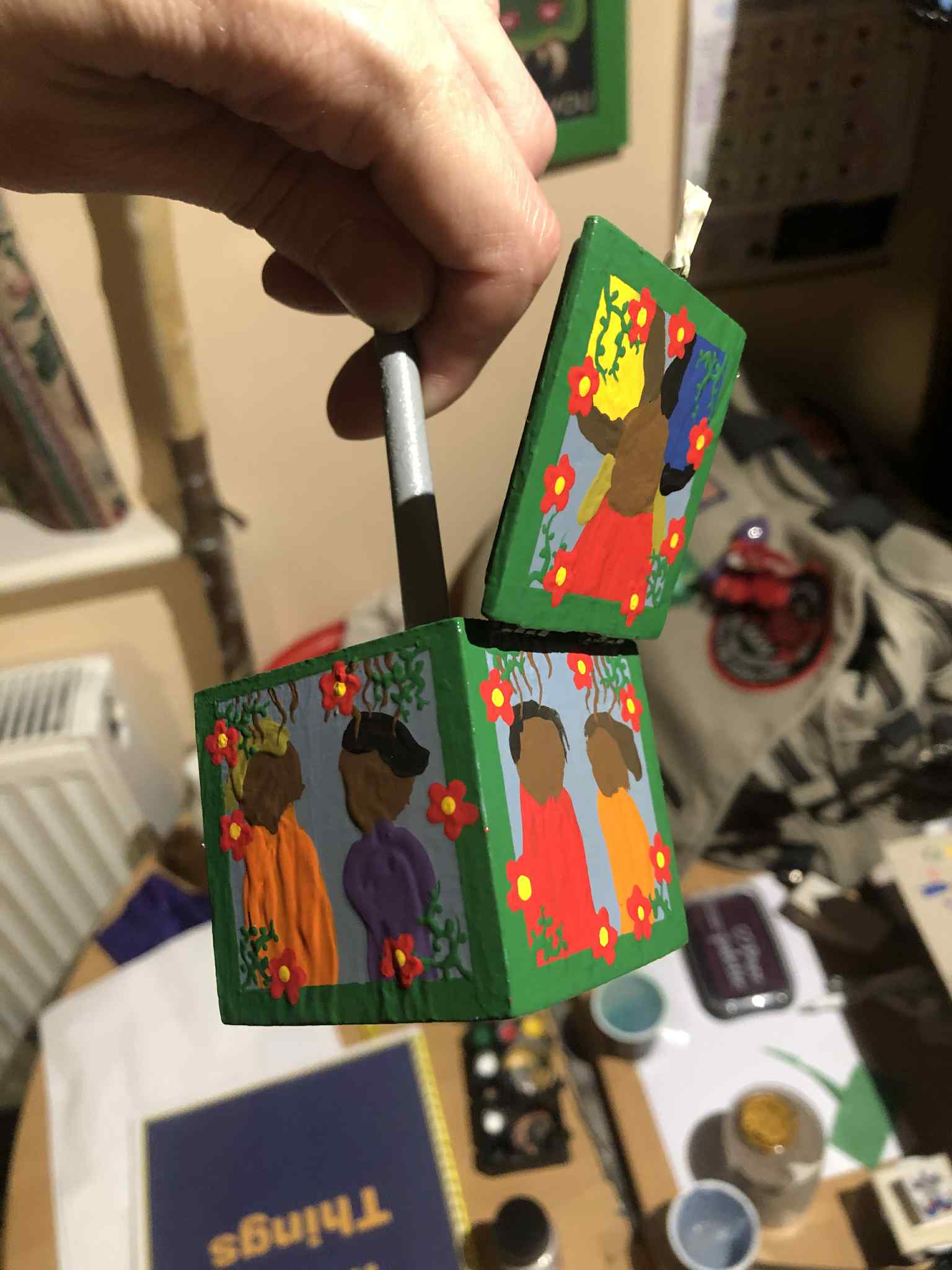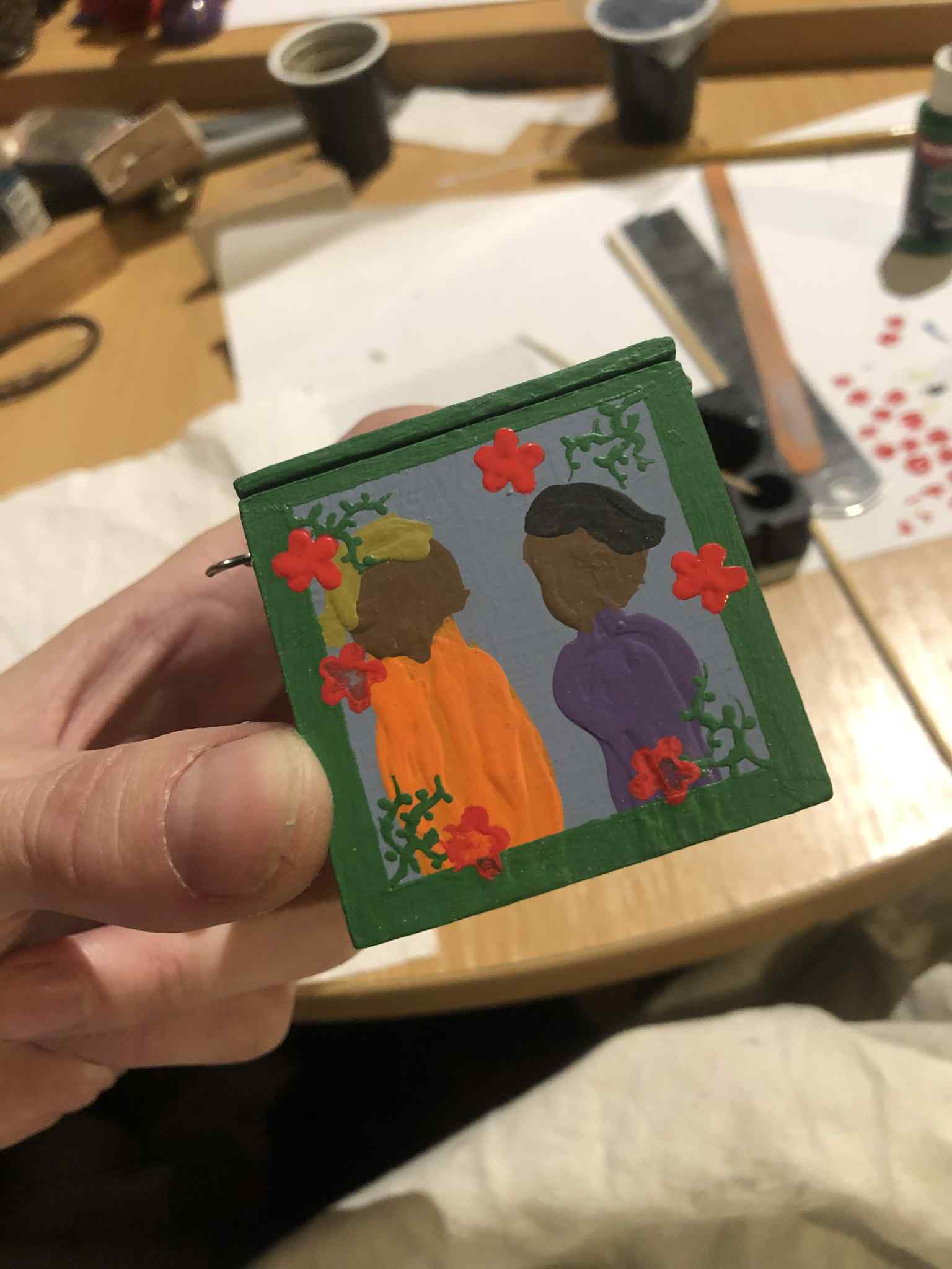 So much like the Efreeti Bottle, this was also not originally going to be made, mainly due to the difficulties of doing so, and it wasn't a "deck" item, but... a printer destined it to be built, so naturally... it had to be. But how, how could I make anything even remotely resembling a Jack-in-the-box??? The answer: You can't. Or rather, I can't. To get it to eject a one of six random selections at the turn of a crank, that is WAY beyond my abilities. But... what I CAN do, if I simplify it down a lot, is make a box that has the six results available to pull from it! So I found a box of bamboo skewers, which would have a long enough base to be able to stick the results to, and I could hack the long stem off to the needed height! Problem, solved. Or rather, concept conceived. I started by just using some scrap cards from the many deck builds to slap together a general idea... a small slot in the middle to hold the... ehhhh, six sticks is *really* small, and not really impressive. Also very rectangular. However, if I double it to twelve, it's more squarish, I can just double each of the results, and it looks a bit more impressive. Ahhh, better. Now, on top of the sticks, since it's supposed to be a Jack-in-the-box, I thought to just put a little clown face at the top of those... y'know those little paper springs that you made as a kid (or maybe like me, still), where you take two paper strips and fold one over the other back and forth over and over to make a spring? Well let's make one of those! It won't spring up much, but it'll be springy! And I can use waterproof paper for the strength factor! I tried plastic strips for a moment, but a) glue wouldn't hold it well, and b) it would be too thick. So waterproof paper it is! And then I had an epiphany! While I can't get a music box inside of there (at least not with my present abilities), what I could do, to at least give a crank *some* use, is put a little jingle bell on the other side, so that when you turn the crank, it will at least make a jingle sound! Yah I know it'll jingle if you shake the thing in general, but it's the principle of the thing. It was either that or glue the crank down and have little text strips beside it saying "pretend you crank this to open it". Having it turn a jingle bell is much better :D We needed to flatten the bell down slightly to fit into there, and even removed half of the cardboard from that side of the inner structure to accomodate it, but it's in there, and it's free-standing away from any surface except the crank it's jb welded to (I dunno, I figure it'll jingle better that way). The crank itself is bent 18 gauge stainless steel wire, with some tiny pieces of like... on the inside of an old broken power inverter, I disassembled it and yanked out some very thin metal plates that were used for electrical contact, trimmed those round, drilled a hole in them, and used those as support on either side of the box side sorta like a bushing. There's also glue in there (I kept cranking it occasionally as it dried) to solidify up the powdered cardboard stuff that this material is in there. So anyway, we made that as strong as we could. Gotta say, it was quite difficult to get that thing through the side to begin with, kinda mangling it through, which is also the reason for all of that, rebuild the mangled cardboard powder at the hole. Anyways, that thing installed, we finished gluing up all the sides, and made a lid for it. Now this brought up its own decisions, since in a regular Jack-in-the-box (and indeed in the DMG image), the side walls should go all the way up, and the lid set into the center of it. But that would require an inner lip, which would shrink the opening (and make it taller), making it more difficult to get your fingers into. So we went with the outer-lip method instead. And with all of that decided, we could begin painting! We started by sanding all of the sides flat, which ended up being to the point that all of the black coating was removed, otherwise it made for weirdly different textures, and hit it with a few layers of primer, sanding between to smooth it all down again (the kinda pressboard powder simply couldn't sand smooth on its own). Since the official art (5e.tools) would be more or less impossible for me to recreate, I decided to go with a more abstract approach, searching for abstract crowd painting (Google image search), and basically did that. Ok, so we've got absract people (with a trippy three bodies one head thing on the lid, just kinda... there wasn't room for three heads so we just tried this, and it works with the creepy vibe in the end. Also heavy impasto for the same vibe), what else is on the official art? Green borders, aight. Actually, clasp first, we came up with what we want to do for that. I'd been rattling around like half a dozen ideas in my head for the lid, do I want to use a pen spring to pop it open (spring is much bigger than I expected), and settled on a simple hook and loop type clasp. We drilled some holes in the appropriate places, added the loops and hooks, and bent them over on the inside (filing partway through the wire to get it to bend at a nice 90 degree angle), and glued those inside the walls. Ok, back to the borders. We created a little corner cover with a pinhole 5mm from either side, and used that to mark a spot around all of the corners (taking into account the lid), and used masking tape to make a straight line between those, and slowly painted all of the borders in. What else we got, vinework in the corners. Let's get some of those going on in there, thank you painting with toothpicks. Flowers, did I want to attempt those red flowers? Let's test making a little stamp out of cardboard. All of the flowers will be more or less identical, but y'know I'm fine with that, theyre simple at best. We needed to blot off the stamp to make it stamp cleanly (making for a cute little blotting paper), and threw a handful of those around the frames, and used
