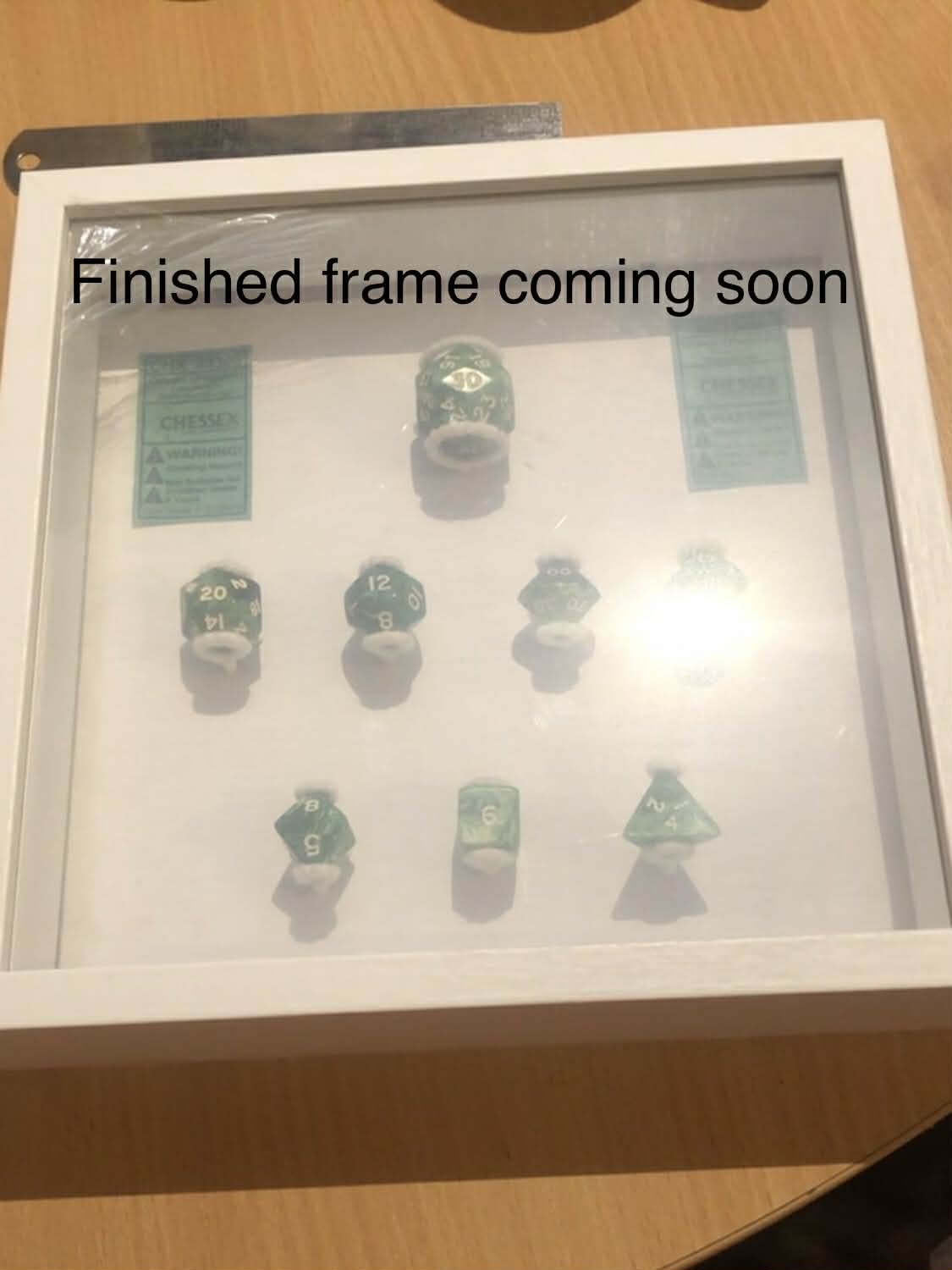 Ok, ok, ok ok ok ok ok, I've been told this... well more than enough times, that the d30 that I got waaaaay at the start of my collection is insanely rare. Like... ludicrous rare. Like people telling me they collect like *all* the dice, and THAT one, THAT one eludes them. Someone called it dice royalty! So I had to. I went and bought... the 7 piece set to go with it. ESPECIALLY after seeing that a Chessex Rainbow Green Peridot d30 has been sold once ==EVER== on english eBay, through all of .com, .ca, and .uk. So I had to. I'd debated whether to piece together my own set, but since the percentile is ALSO apparently extremely hard to find, we got the full set off of eBay (strangely from Flin Flon Manitoba, very near to where I used to live)! Aaaand that my friends. That set of eight dice, as of January 2026, are worth £300gbp / $400usd / $500cad! Those seven dice arriving over doubled in price the second they arrived at my door (February 16th)! And so... we made a frame for them (build page here). Aaand we now have them on display (as soon as the display is done). And that my friends... that is how we will preserve and present this incredible set of dice. This dice goblin is happy ^_^ |