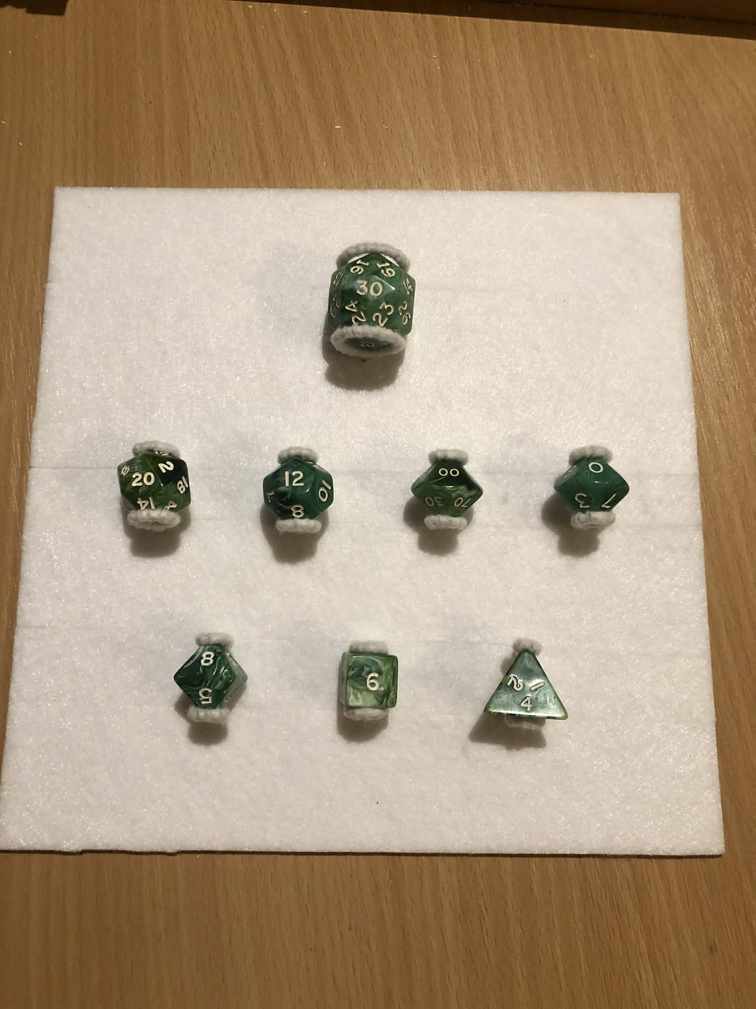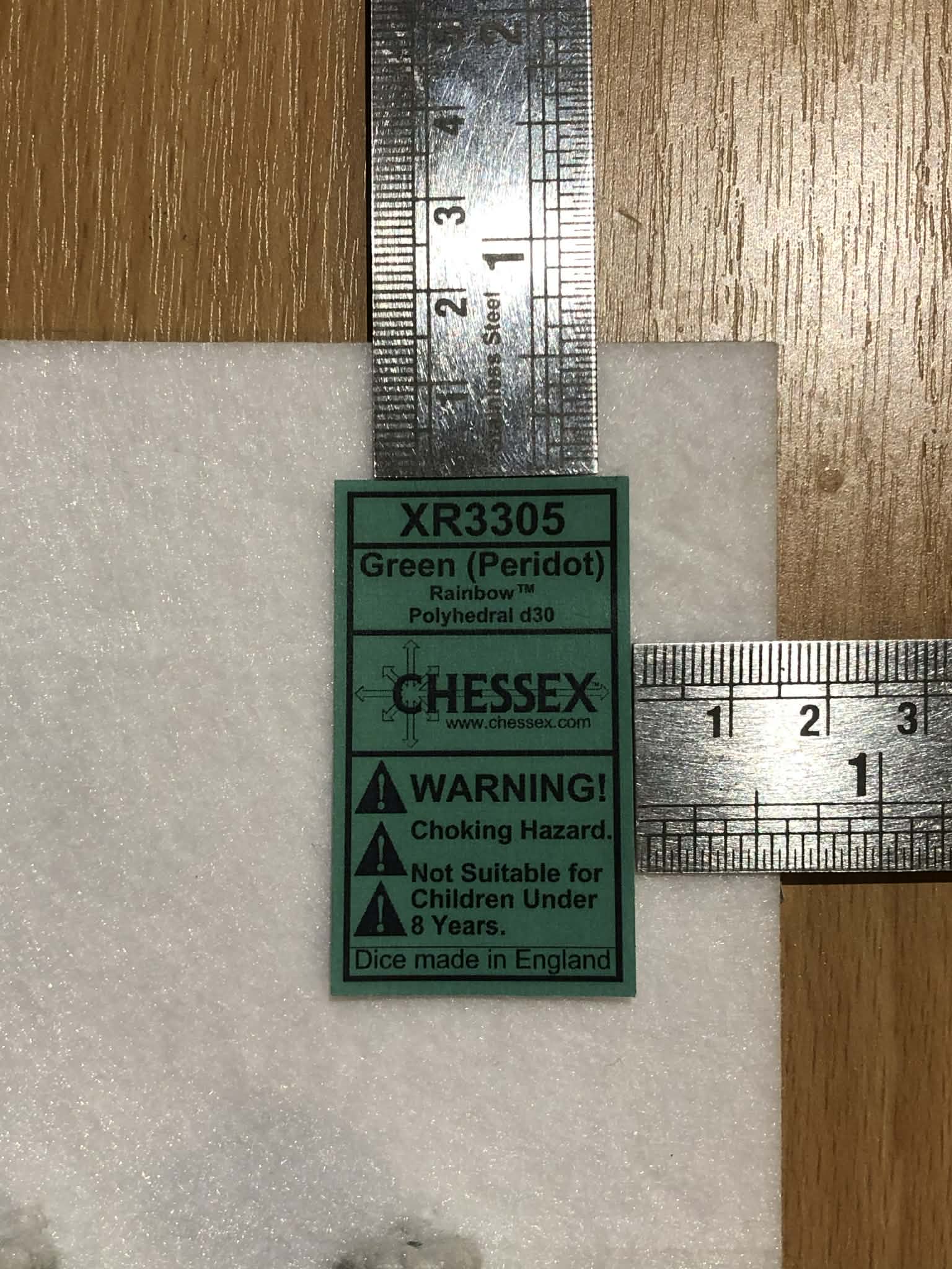The frame build page! I originally started this on the dice page, but the progress was starting to get complicated enough that I didn't want it cluttering the dice page, so you get your own page here, tuck you away back here. As I'd said on the main page, I'd debated whether to piece together my own set, and had actually paid far less for a partial set before researching more and discovering that the percentile is ALSO extremely hard to find. So rather than worry about never finding that (the partial set will be for my rolling dice, so I can still enjoy playing with this pattern ^_^ . Also they could be good for tradeables!), I just ordered the full set listed (strangely from Flin Flon, very near to where I used to live)! Aaaand that my friends. Those eight dice, as of January 2026, are worth £300gbp / $400usd / $500cad! Those seven dice arriving over doubled in price the second they arrived at my door (February 16th)! Naturally, we need to display these. A shadow box frame will suit this best, with the dice gently suspended to be as fully visible as possible. Also, I have already attempted to contact Chessex in order to get an info label that they normally come with for the display, but they said that this set CHX 23305 is so old (out of print in 2001, older than Zebeth!!!), that they don't have any copies of it in their archives, or system at all! So we will have to make a mock-up to put in the frame with them (and label it as such on the back of the label, for transparency purposes). So... let's get started! Ooohhhh, and leading up to this, we did some research, and found some epic things. First, allow me to link you to the present day webpages for these dice on the DrNoD DiceDB (db.drnod.de) and Miraheze Dice Collecting wiki (dice.miraheze.org). Secondly, we decided to dig into the Chessex webpage (chessex.com), but on archive.org, where we found the first mention of these as a polyhedral set in 1999 (archive.org), the first mention of the poly set as CHX 23305 Rainbow™ Peridot™(Green)/white (also CHX 23305 Rainbow™ Polyhedral Green/white 7-Die Set) in June 2000 (archive.org), the first mention of the d30 as XR3005 - Rainbow™ Polyhedral d30 - Peridot™ (Green) in October 2000 (archive.org) (images weren't backed up in those though, but the 1999 link shows the d6 of the poly set (screenshot), and the full poly image was backed up in July 2001 (archive.org) (screenshot), and the d30 also in July 2001 (archive.org) (screenshot).